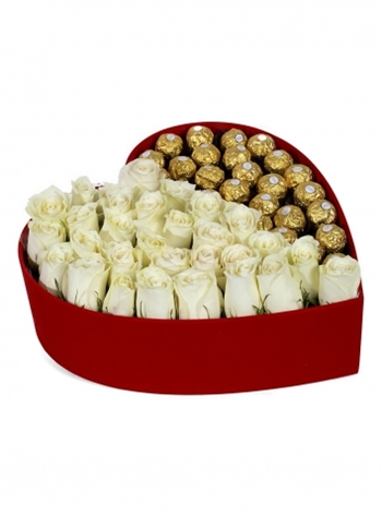 Kırmızı kutu içerisine güller ve çikolatalardan hazırlanmıştır