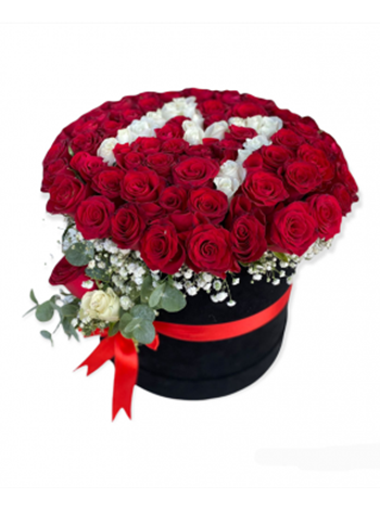 Siyah silindir kutu içerisinde kırmızı ve beyaz güllerden hazırlanmıştır.
