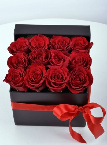 Siyah Kutu içinde 12 Adet Kırmızı Güllerden Hazırlanmıştır.