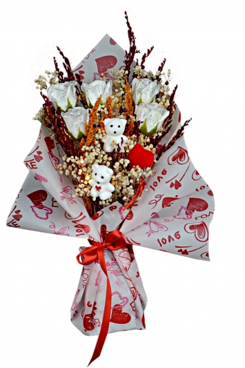 Parlayan Beyaz Gül ve Ayıcık Buketi