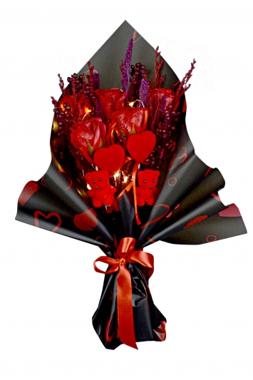 Işıklı simli kırmızı gül ve ayıcık buketi