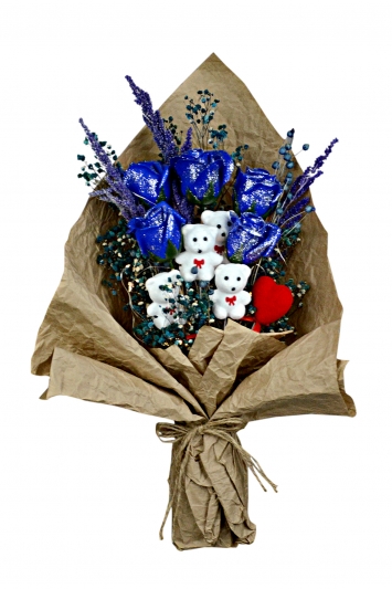 Işıklı, simli yapay mavi gül ve ayıcıklı buket