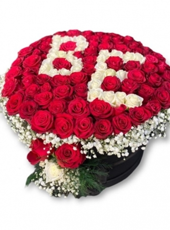 Siyah silindir kutu içersinde kırmızı ve beyaz güllerden hazırlanmıştır.